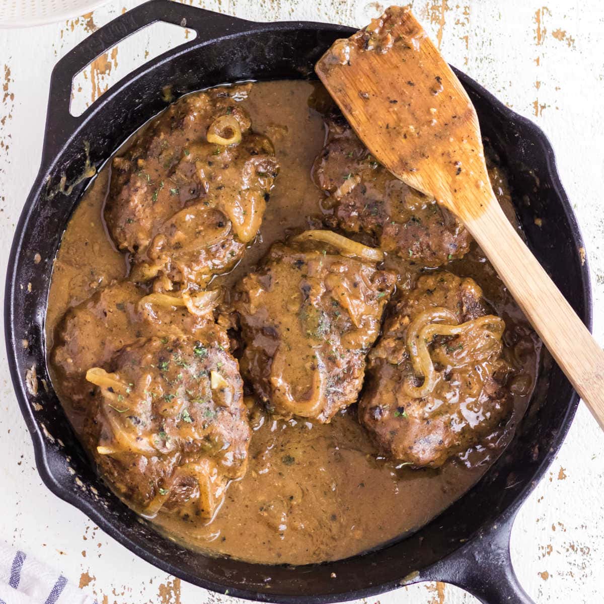 Copycat Cracker Barrel hamburger steak and onion gravy recipe is hearty comfort food that's easy to make - even on a busy Sunday! Seasoned hamburger steaks are seared in a skillet on top of the stove then simmered in a rich onion gravy until they are tender and juicy!